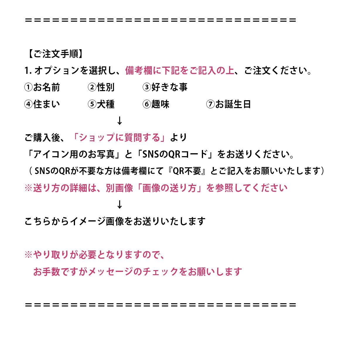 購入後、メッセージにてアイコン用のお写真とSNSのQRコードのお写真をお送りください。