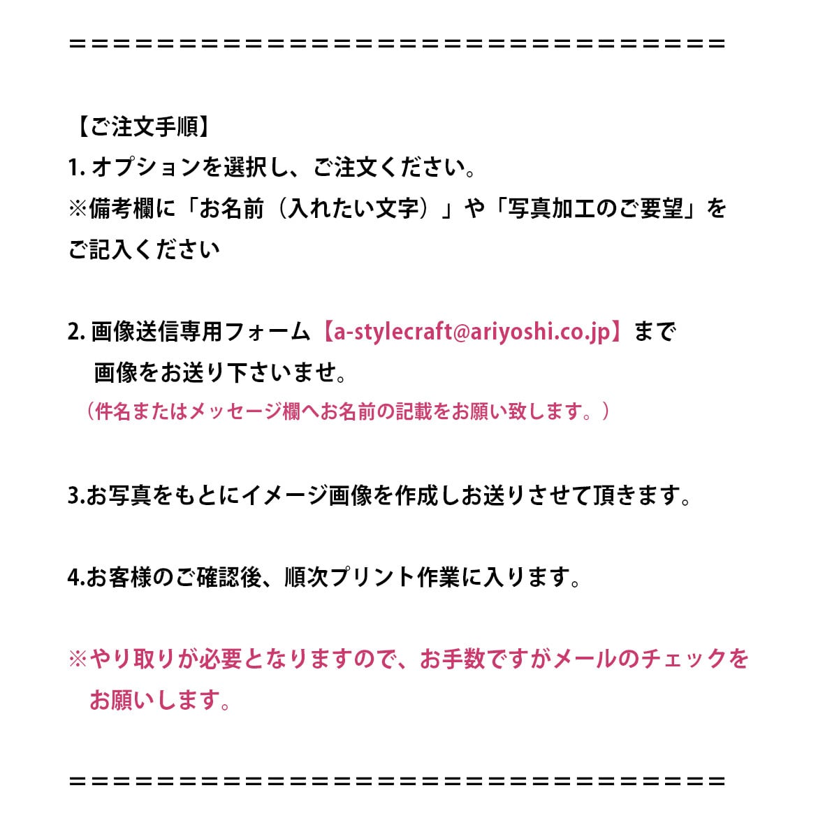 ※メールにてお写真をお送り頂く際には件名またはメッセージ欄へお名前の記載をお願い致します。