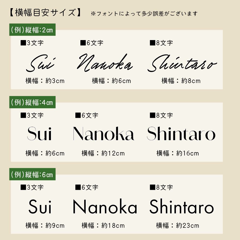 ※サイズは縦幅に合わせますので文字数や字体等で横幅は変わります。