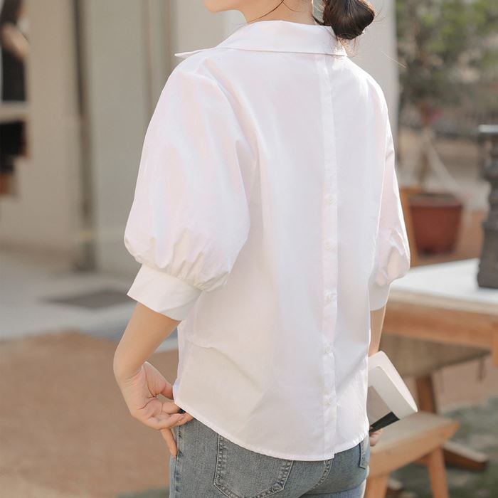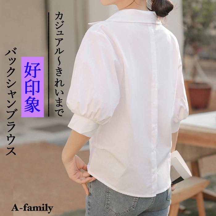 903 バックシャンブラウス パフスリーブ スキッパーブラウス シャツ レディース シフォン 5分袖 Vネック ゆったり 半袖 上品 きれいめ 大人可愛い パフスリーブ 折り襟 おしゃれ 春夏 通勤 仕事 無地 オフィス カジュアル | A-family(えぇふぁみりー)