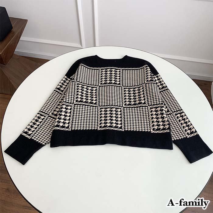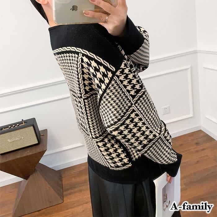977 千鳥格子柄 カーディガン レディース 秋冬 冬 厚手 トップス 羽織り 暖かい 30代 40代 50代 上品 大人 美人 大きいサイズ ブラック ホワイト ラウンドネック 千鳥格子柄 総柄 モノトーン きれいめ エレガント オフィス